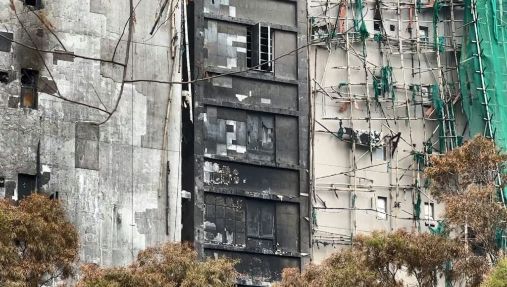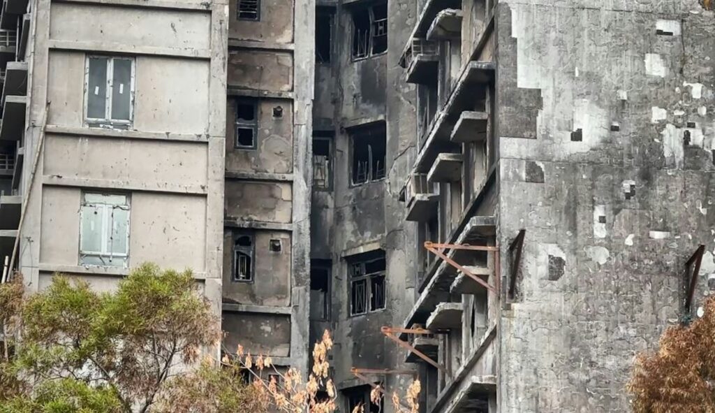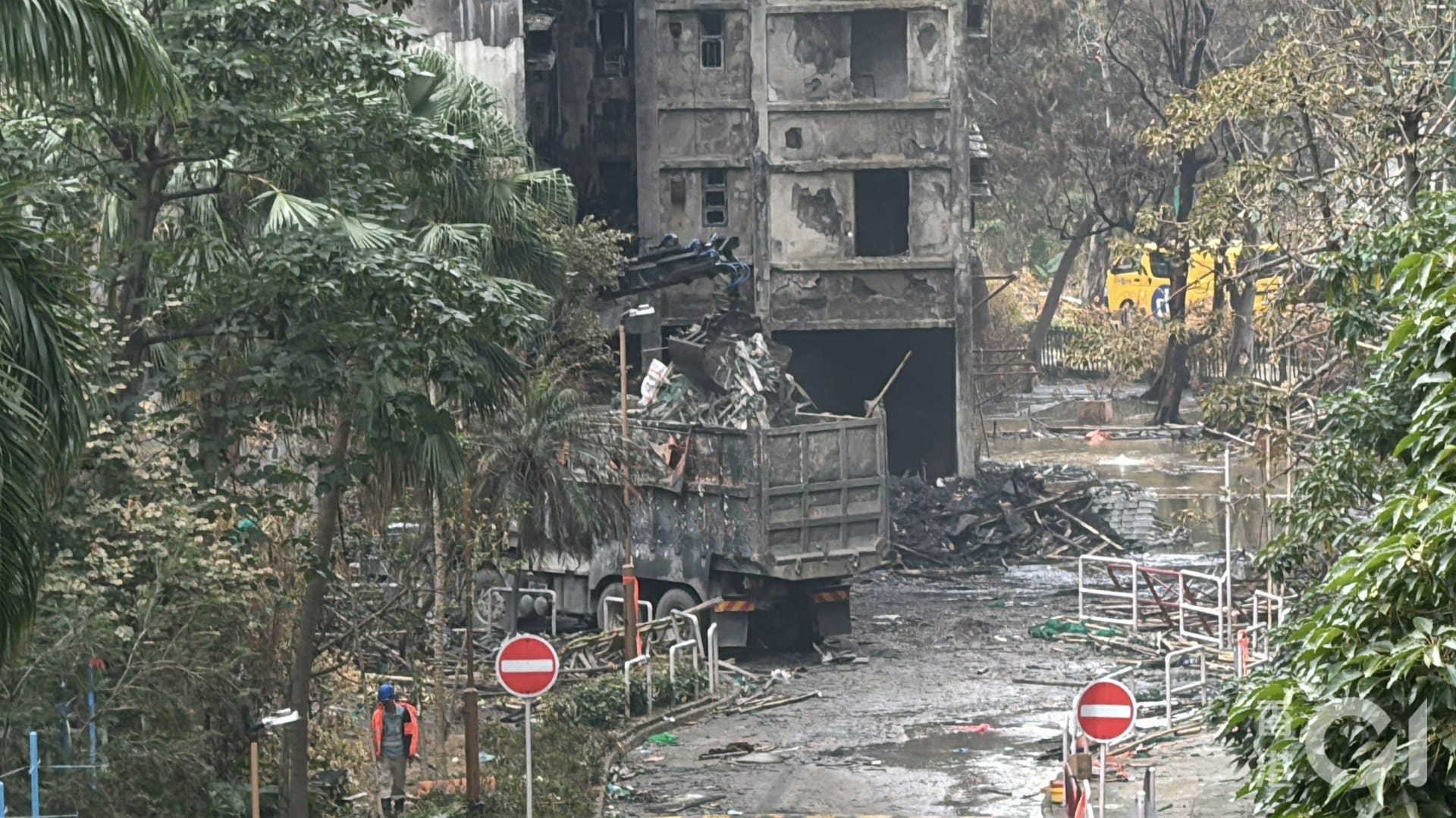 今日早上九時前後,多輛工程車相繼抵達宏福苑宏昌閣外,包括吊臂車及石屎泵車。工人隨即把建材運入受損單位,進行必要鞏固。部分棚架已被拆除,燒黑牆面及破損窗戶清晰可見,顯示火勢當時蔓延迅速,造成嚴重結構損傷。