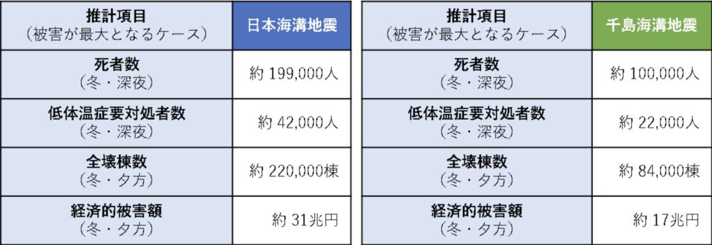 內閣府表示,預測模型以二〇一一年東日本大地震為主要參考,加上最新科學資料,評估日本海溝及千島海溝沿線若再發生特大地震所可能造成的影響。相關計算涵蓋建築物破壞、海嘯高度及救援能力等多方面因素。